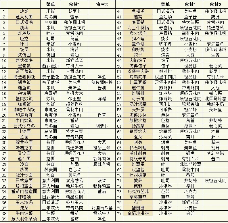 只要菜单和食材正确就可以制作出新的料理,并不需要一定去解锁食谱才能制作。在料理和食材选择不符合任何一种菜谱时。会对原有的料理进行加强,八维以及味道,魅力,价格。