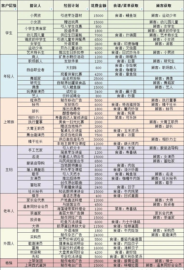 经营计划中前缀为食谱的是仅仅获得食谱,前缀为菜单的是会获得可以直接上架以及制作后续菜谱的料理。