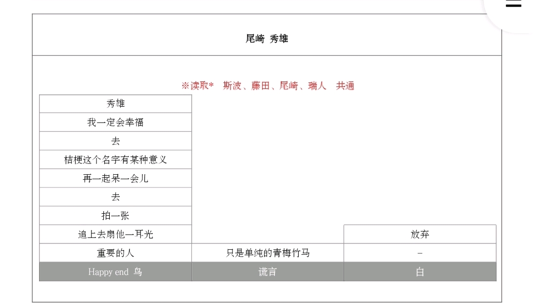 【谎言】:秀雄未婚妻坚持不退婚后,百合子觉得自己只能放弃秀雄,转而答应了斯波的求婚。但是暗地里定时和秀雄约会,斯波也默认了他们这种关系。这个结局的秀雄因爱生恨,每次跟百合子约会都要用先言语狠狠地修容百合子,甚至为百合子剃去毛发你们懂的。以此来惩罚背叛了自己的百合子,同时也是对自己的惩罚,那些言语也像刀刃一样,划伤两个人的心。但是秀雄每次羞辱完百合子之后,自己反而更痛苦,最后会哭着温柔地对百合子道歉。