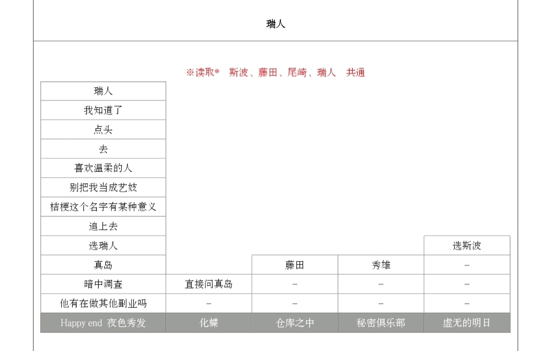 【秘密的共犯】:攻略上打错了,这个结局是秘密的共犯。这个就是瑞人线唯一一个重口结局了。秀雄发现瑞人在卖身后急急忙忙冲到野宫家,正好撞到瑞人用毛笔与百合子"嬉戏"的场景。然后瑞人用药把秀雄迷晕之后,为了不让秀雄把他俩的事情暴露出去,决定让纯洁的秀雄也沾上情爱的淤泥,变成他们的共犯。于是瑞人便诱惑教唆百合子让她服侍秀雄。