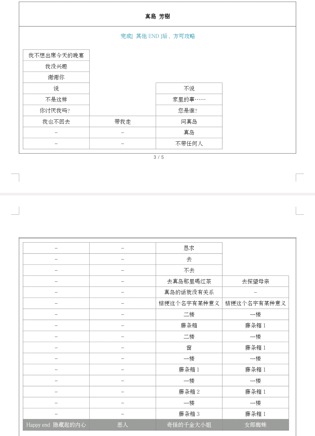 【晚安】:百合子误把斯波当成了害野宫家负债累累并杀害父亲的凶手。在上个结局真岛没用到的下了毒的红茶也用上了。在喝了有毒的红茶的晚上,百合子做了个梦,梦到自己和真正的哥哥在幼年玩耍的时光。